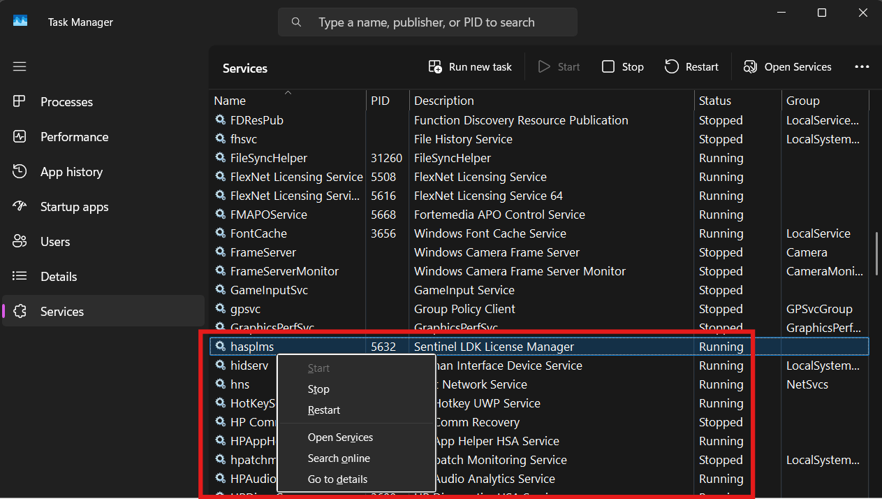 - From Task Manager> Services Tab look for hasplms.exe | Sentinel LDK License Manager