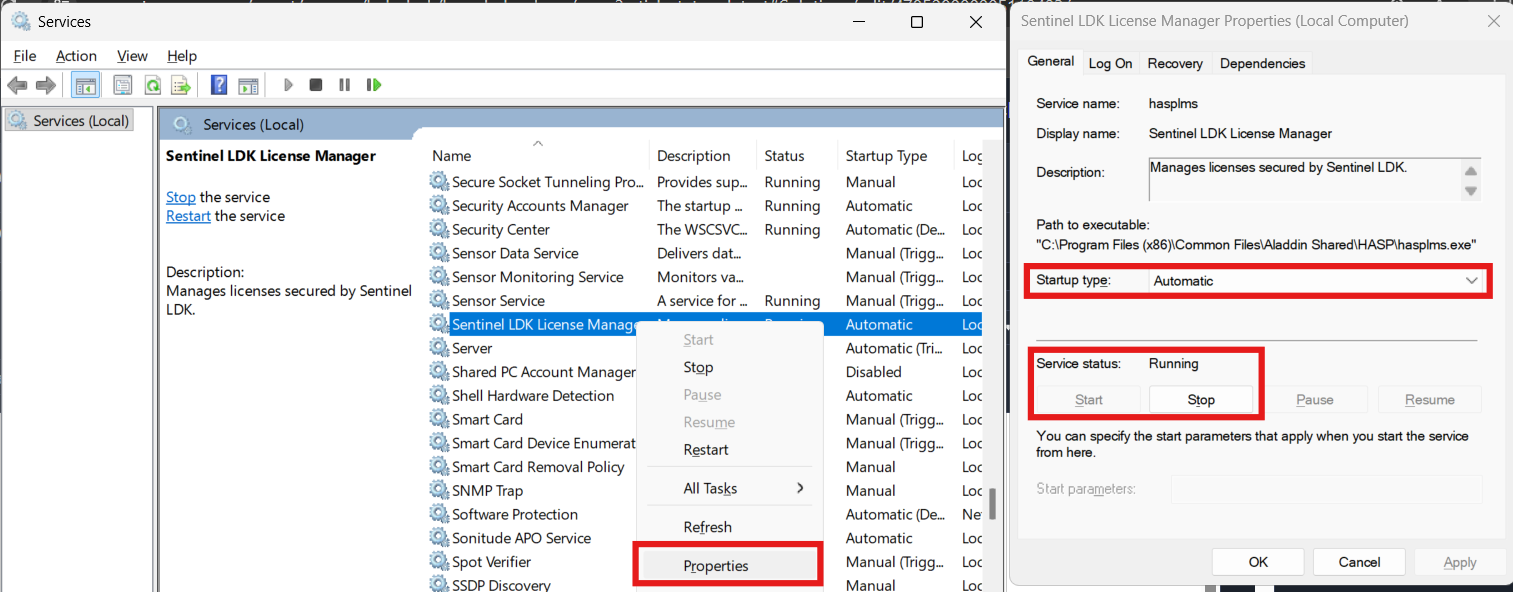 - Locate Sentinel LDK License Manager in the list, right click and select Start. If the Start option is greyed out, click Properties and change Startup type to Automatic first.