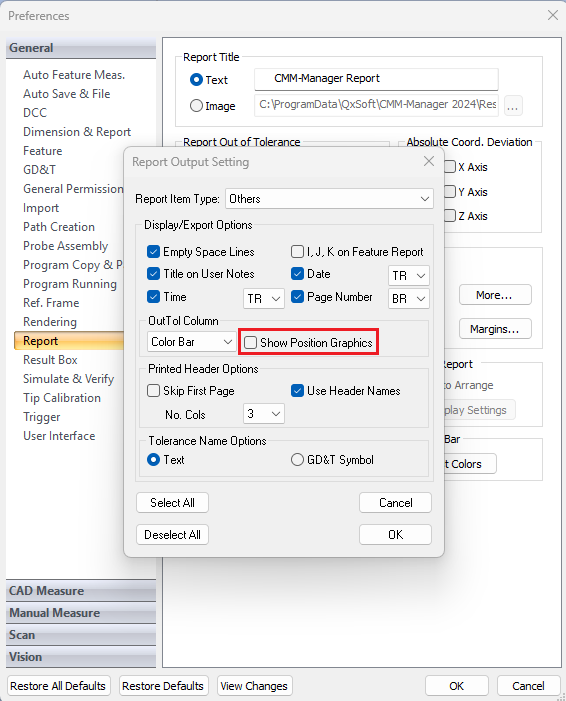 When this option is enabled and when a report item has an applicable graphic, the graphic will overwrite the option set in the OutTol Column dropdown in preferences within the built in CMM-Manager report.