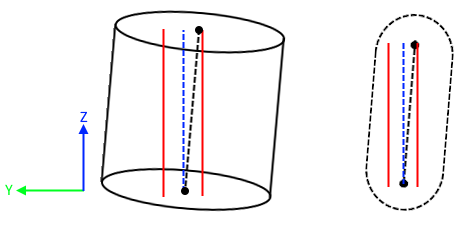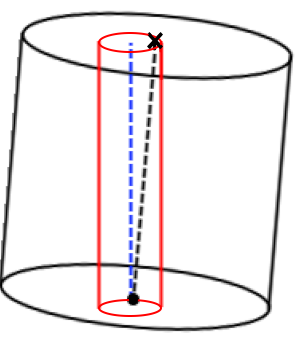 The image below shows a cylinder with the base point, marked as a black dot, and the length point, marked as a black "X". The red cylinder is defined as a cylinder with the same base point, axis vector, and reference length as the nominal cylinder, but with a diameter of the tolerance value. The black dashed line represents the cylinder axis. Think of the report graphic above as a top down view of this image where the graphics circle is the top/bottom of the red cylinder and everything else projected onto the plane of that circle.