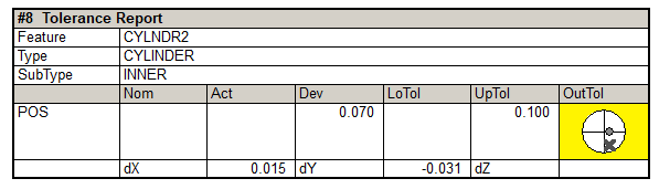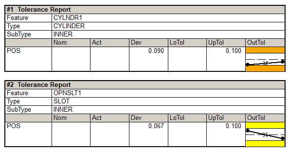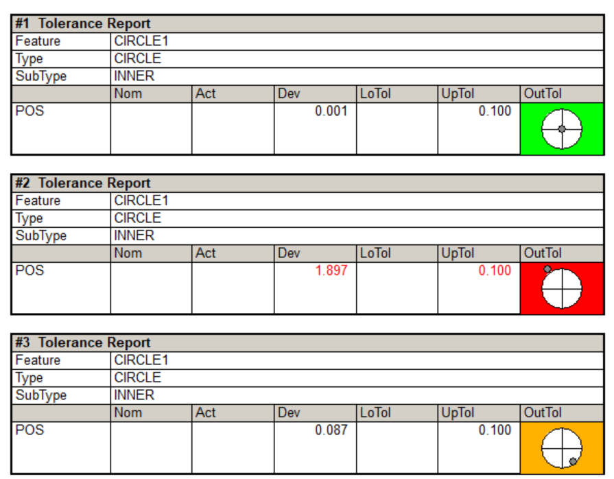 If the deviation is within tolerance, the scale of the position indicator to the target center will be correct relative to the tolerance value; however, if the deviation is significantly out of tolerance, the scale will be shrunk in order to ensure that the dot is displayed in the graphic. The second report in the image above has a large deviation, but the position indicator is still viewable. This allows the direction that the true position is off to be visualized