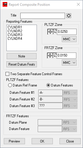 Assuming that your current reference frame represents the datum reference frame for PLTZF (ABC), the composite position settings required to output the report correctly is below. Please note that diameters of all 4 circles must be reported beforehand for the MMC options to be enabled.